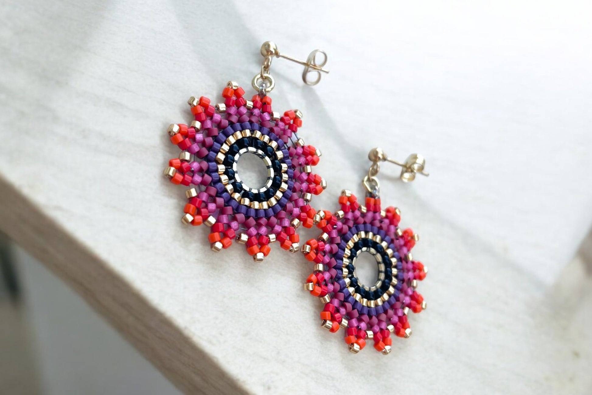 Jemné náušnice ve tvaru slunce jsou šité z japonských skleněných korálků.