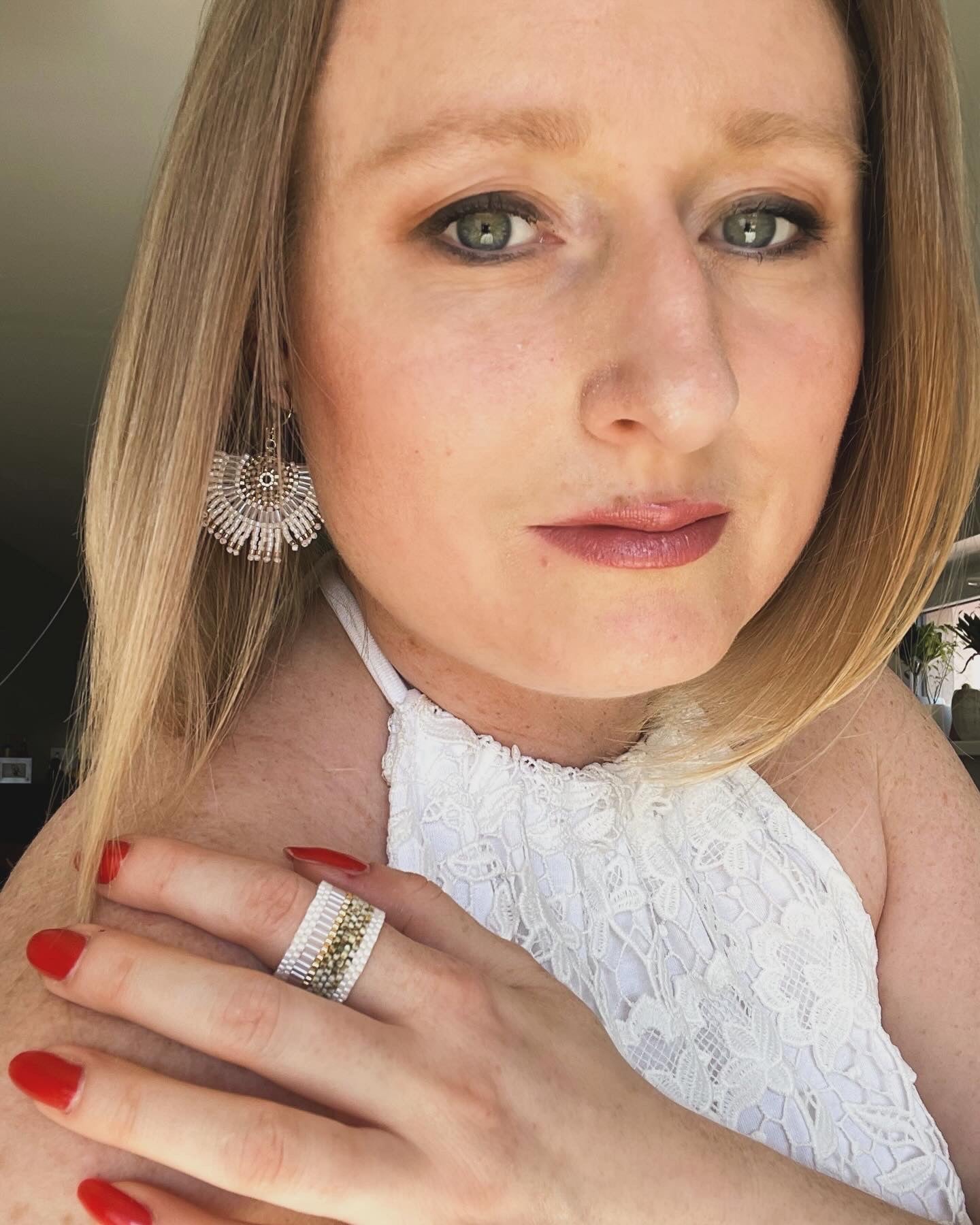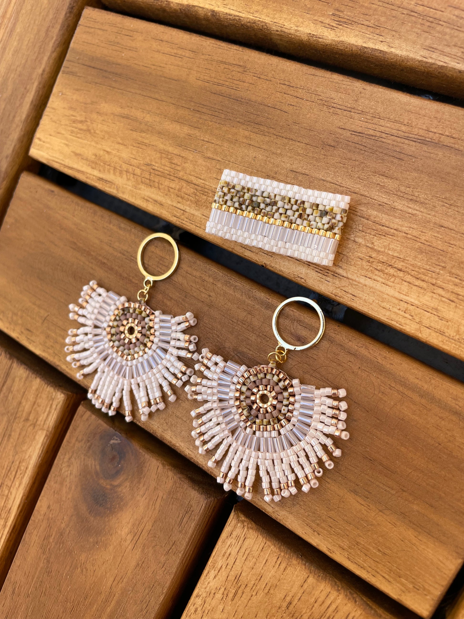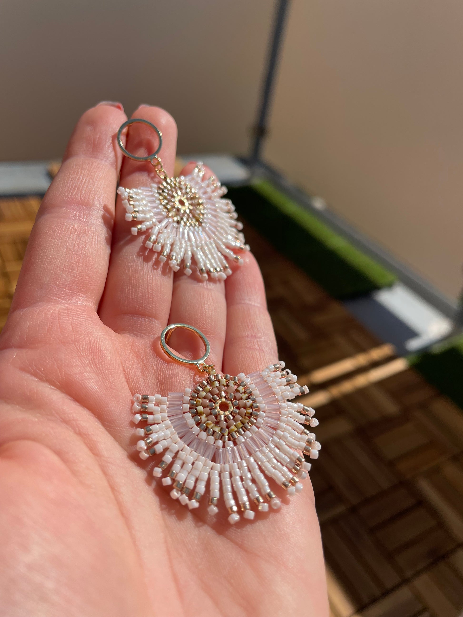 Jemné náušnice ve tvaru vějíře jsou ručně šité z japonských skleněných korálků MIYUKI Delica.