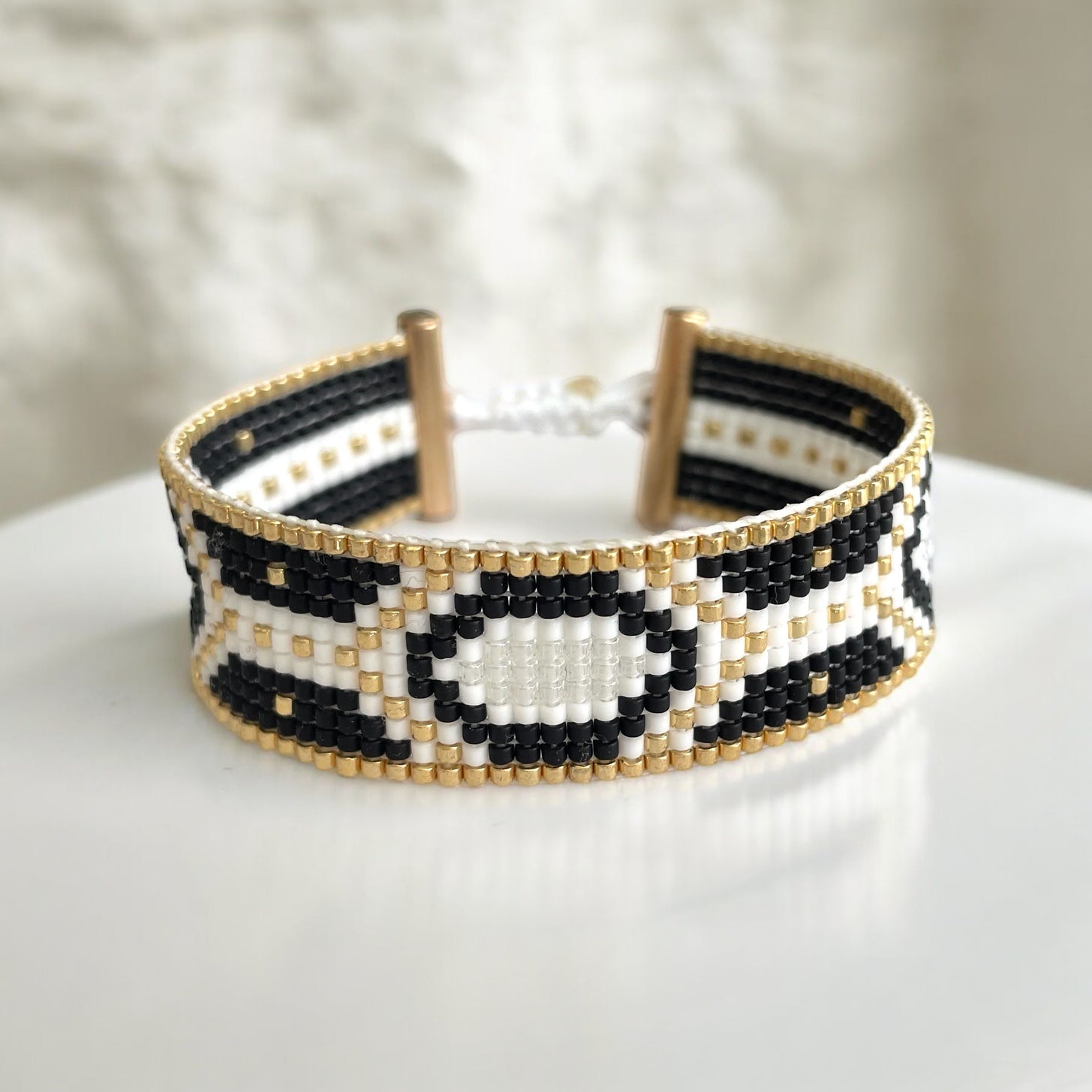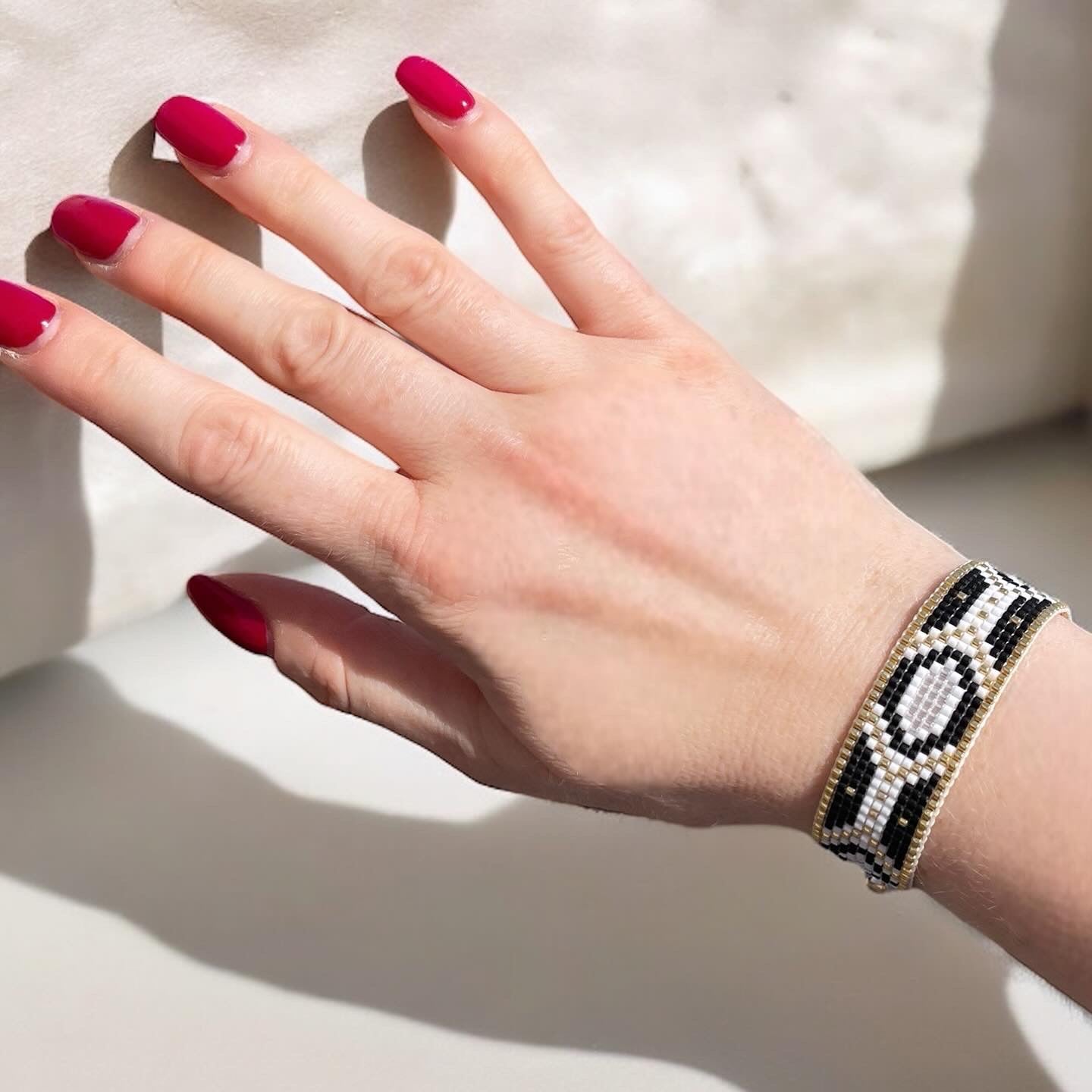 Náramek je tkaný z japonských korálků a kvalitních odolných vláken.