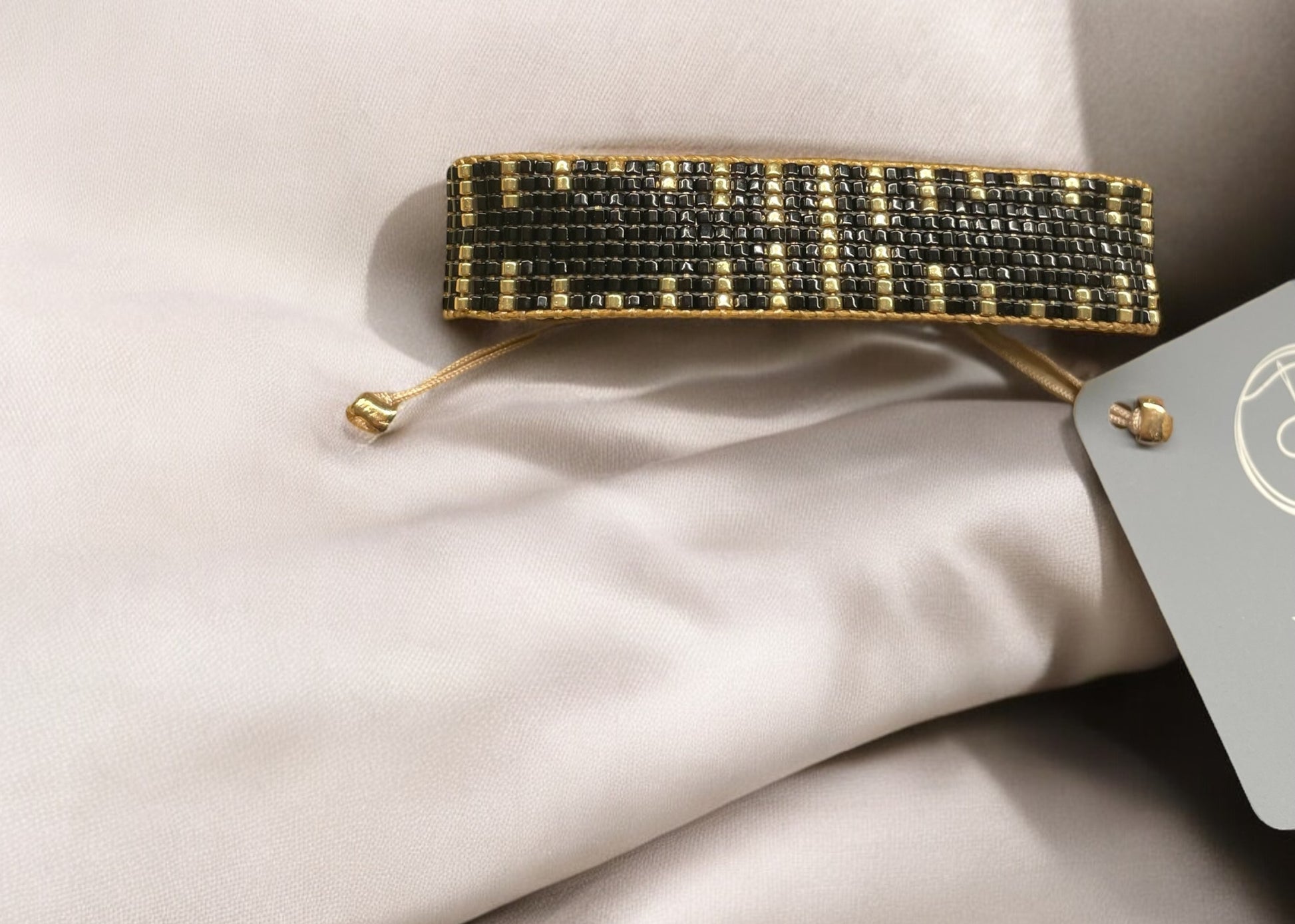 Náramek je tkaný z japonských korálků a kvalitních odolných vláken.