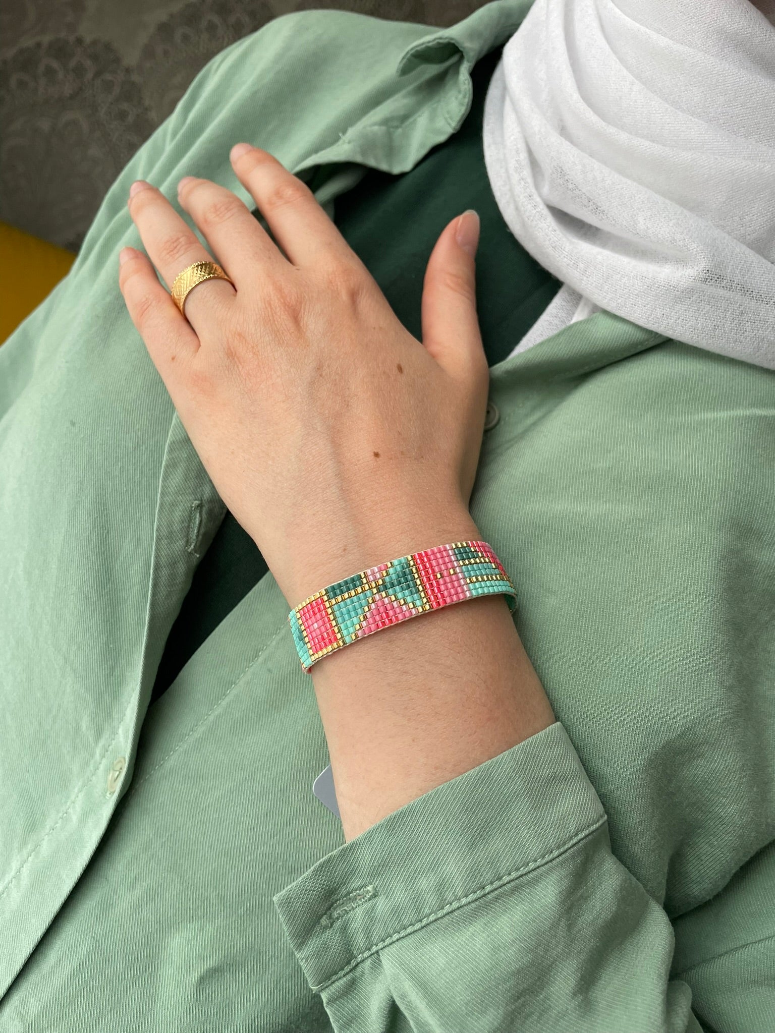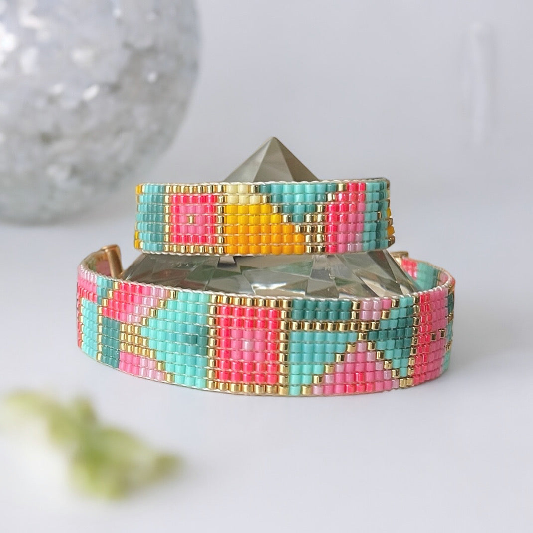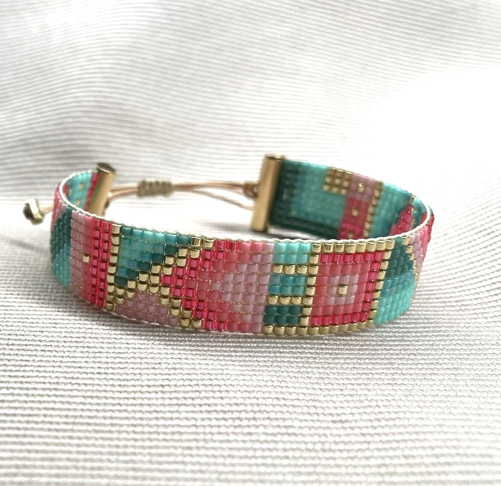 Náramek je tkaný z japonských korálků a kvalitních odolných vláken.